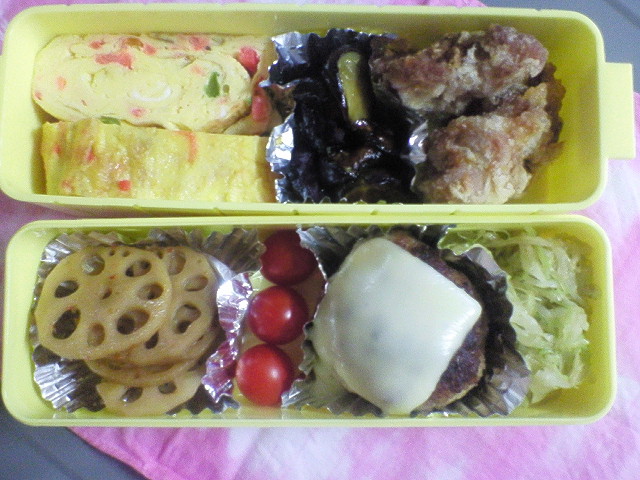 ハンバーグはいつも一個あたり150gの種ですが、お弁当用に50gにして、とろけるチーズを1/4中に入れ焼きました。